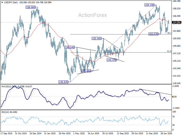 USD/JPY’s strong rebound last week suggests that fall from 157.65 has completed at 152.25. Initial bias is turned neutral this week firs. On the upside, above 155.63 will resume the rally from 152.25 and target 157.65 first. Overall, with 38.2% retracement of 139.87 to 159.44 at 151.96 intact, rise from 139.87 is expected to resume through 159.44 at a later stage.