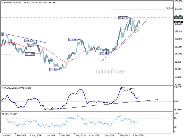 In the bigger picture, outlook is unchanged that corrective pattern from 161.94 (2024 high) should have completed with three waves at 139.87. Larger up trend from 102.58 (2021 low) could be ready to resume through 161.94. This will remain the favored case as long as 55 W EMA (now at 151.71) holds. However, sustained break of 55 W EMA will argue that the pattern from 161.94 is extending with another falling leg.