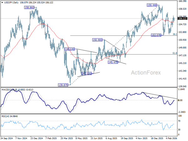 USD/JPY’s strong rebound lost momentum after hitting 156.81. Initial bias stays neutral this week first. Nonetheless, current development solidifies the case that price actions from 159.44 are merely a near term consolidation pattern. In other words, rise from 139.87 is still in progress. Above 156.81 will target 157.65 resistance and then 159.44 high. On the downside, however, break of 153.90 will bring deeper fall to 152.25 support. Still overall outlook will remain bullish as long as 38.2% retracement of 139.87 to 159.44 at 151.96 holds.