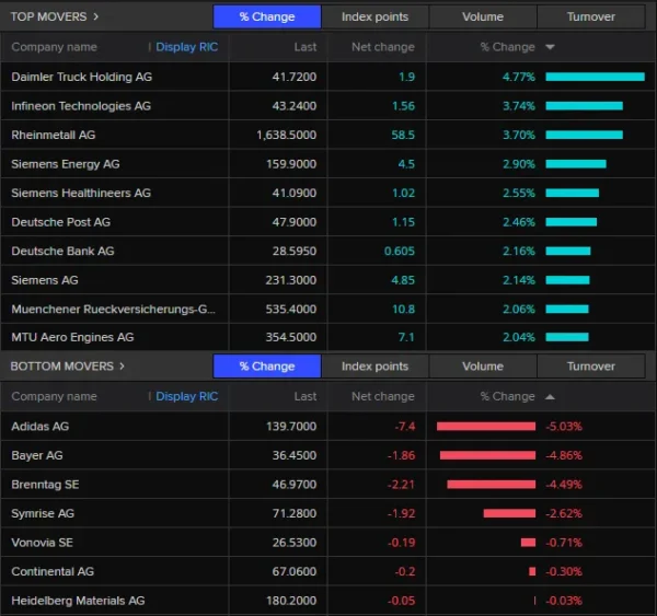 - Market performance is mixed: Technology and defense stocks are providing upward momentum, while disappointing earnings from Adidas and Bayer are weighing on the index.