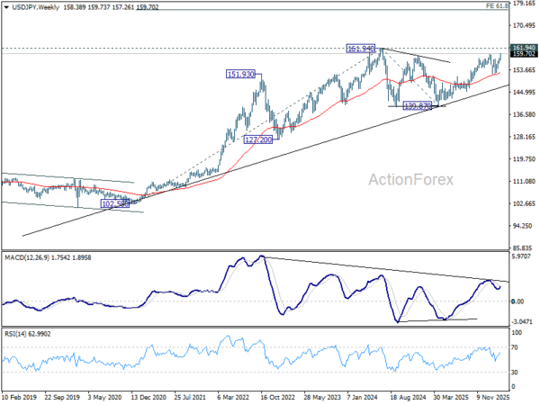 USD/JPY’s up trend from 139.87 resumed by breaking through 159.44 last week. Initial bias remains on the upside this week for retesting 161.94 high first. Firm break there will confirm larger up trend resumption and target 61.8% projection of 139.87 to 159.44 from 152.25 at 164.34. On the downside, below 158.55 minor support will turn intraday bias neutral first.