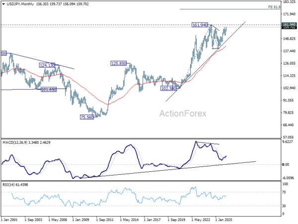 In the bigger picture, outlook is unchanged that corrective pattern from 161.94 (2024 high) should have completed with three waves at 139.87. Larger up trend from 102.58 (2021 low) could be ready to resume through 161.94. This will remain the favored case as long as 55 W EMA (now at 152.16) holds. Firm break of 161.94 will pave the way to 61.8% projection of 102.58 to 161.94 from 139.87 at 176.75.