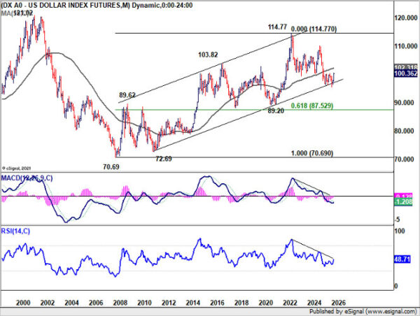 From a longer-term perspective, a sustained move above 101.13 would also carry important implications for the Dollar’s structural outlook. Such a breakout would likely push Dollar Index through the 55 M EMA (now at 102.31).