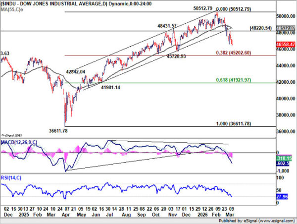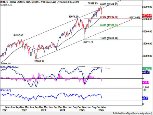 Nevertheless, decisive breakdown below 45,000 would mark a significant shift in the technical outlook. Such a move would imply that the entire advance from the 36,611.78 base (2025 low) is reversing and could expose DOW to deeper fall toward 61.8% retracement at 41,921.97. A decline of that magnitude would likely amplify risk-off flows and further support Dollar.