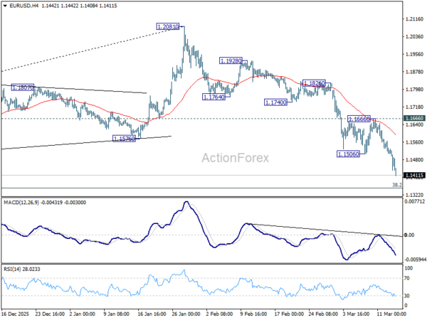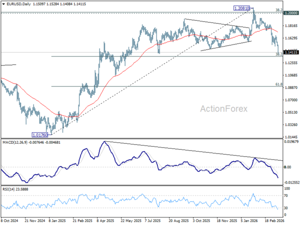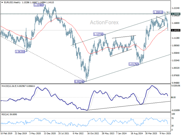 In the bigger picture, the break of 55 W EMA (now at 1.1495) confirms rejection by 1.2 key cluster resistance level. The whole up trend from 0.9534 (2022 low) might have completed as a three wave corrective rise too. In either case, deeper fall is now expected to long term channel support (now at 1.0528. Risk will stay on the downside as long as 1.2081 holds, in case of recovery.