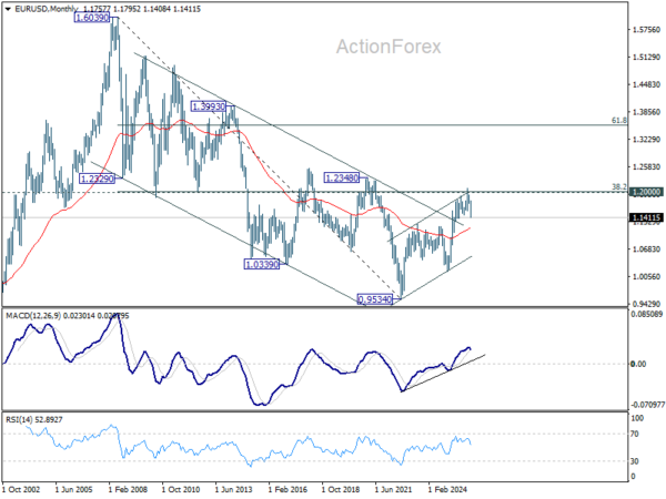 In the long term picture, 38.2% retracement of 1.6039 to 0.9534 at 1.2019, which is close to 1.2000 psychological level is the key for the outlook. Rejection by this level will keep the multi decade down trend from 1.6039 (2008 high) intact, and keep outlook neutral at best. However, decisive break of 1.2000/19, will suggest long term bullish trend reversal, and target 61.8% retracement at 1.3554.