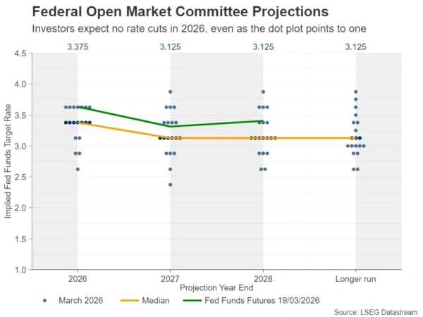 Getting the ball rolling with the US, the Fed decided to hold interest rates unchanged as expected and projected higher inflation and steady unemployment. Although the new dot plot continued to point to a single 25bps rate reduction by the end of 2026, Fed Chair Powell said that the uncertainty surrounding the rate path has increased markedly amid the war in the Middle East, and that a “meaningful” number of his colleagues are now favoring less easing than they did three months ago. Indeed, according to the plot, the number of officials favoring interest rates to remain untouched by the end of the year has increased to seven from four in December.