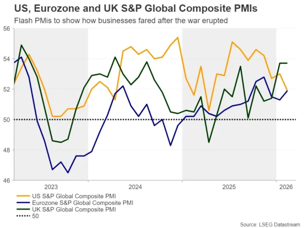 Of course, this does not mean that there are no data releases for traders to pay attention to. The spotlight may be on the preliminary PMIs for March from several major economies as they will provide a first glimpse of how business activity fared after the war erupted and what the impact of skyrocketing energy prices were.