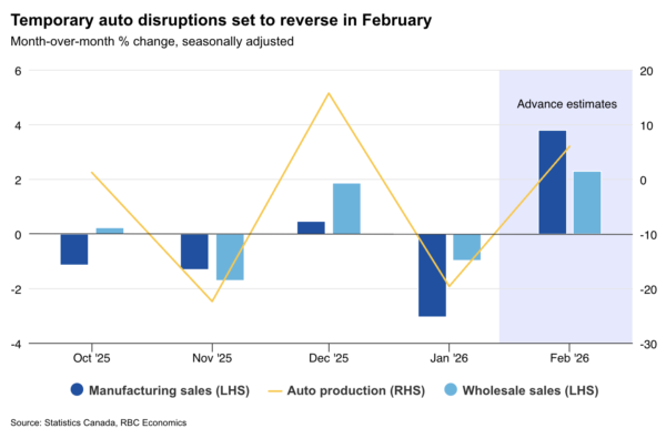 Weakness was concentrated in the auto sector, where production disruptions at Ontario plants drove manufacturing and wholesale sales down 3.9% and 1.5%, respectively. Early indicators, however, point to a partial rebound in February as disruptions unwound.