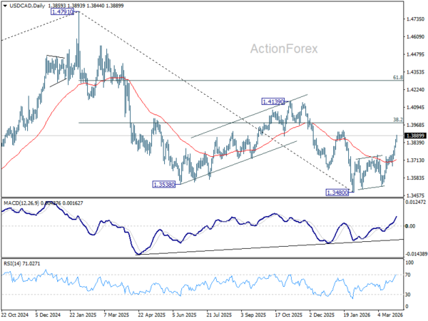 USD/CAD’s rebound from 1.3480 accelerated high last week. Initial bias stays on the upside this week for 38.2% retracement of 1.4791 to 1.3480 at 1.3981. Decisive break there will argue that it’s already reversing the whole down trend from 1.4791, and target 61.8% retracement at 1.4290. On the downside, below 1.3844 minor support will turn intraday bias neutral first. But risk will stay on the upside as long as 1.3751 resistance turned support holds, in case of retreat.