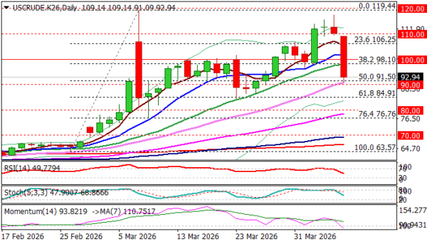 Technical picture on daily chart has weakened following the latest sharp drop that formed large bearish daily candle (the biggest daily loss since March 9), with 14-d momentum breaking into negative territory and RSI / Stochastic heading south, contributing to bearish signal developed on break through $100 (psychological) and $98.00 zone (Fibo 38.2% of $63.57/$119.44 / 20DMA).