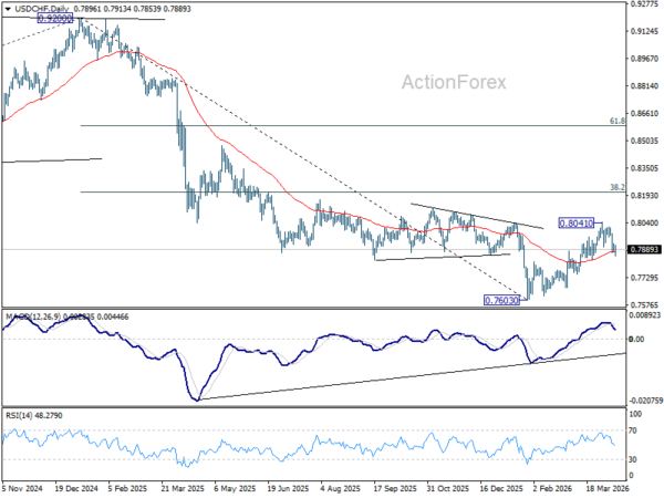USD/CHF extended the pullback from 0.8041 short term top, but failed to sustain below 0.7877 cluster support (38.2% retracement of 0.7603 to 0.8041 at 0.7874). With 4H MACD crossed above signal line, initial bias is turned neutral first. On the downside, sustained trading below 0.7874/7 will argue that the rise from 0.7603 has completed, and bring deeper fall to 61.8% retracement at 0.7770 and below. Nevertheless, above 0.7925 minor resistance will turn turn bias back to the upside for retesting 0.8041.