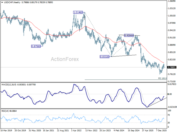 In the bigger picture, rebound from 0.7603 medium term bottom is seen as correcting the fall from 0.9200 only. Rejection by 55 W EMA (now at 0.8081) will affirm this bearish case, and setup down trend resumption to 100% projection of 1.0146 (2022 high) to 0.8332 from 0.9200 at 0.7382 at a later stage. Though, sustained break of 55 W EMA will suggest that it’s probably correcting the larger scale down trend from 1.0146 (2022 high).