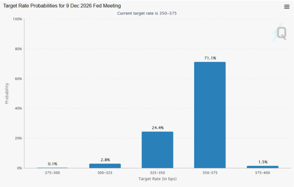 Market pricing reflects this balance. Futures indicate minimal probability of rate hikes by the end of the year, with odds near 1.5%. The majority expectation remains for the Fed to hold at 3.50–3.75% before eventually easing. In other words, rate cuts are seen as delayed rather than cancelled.