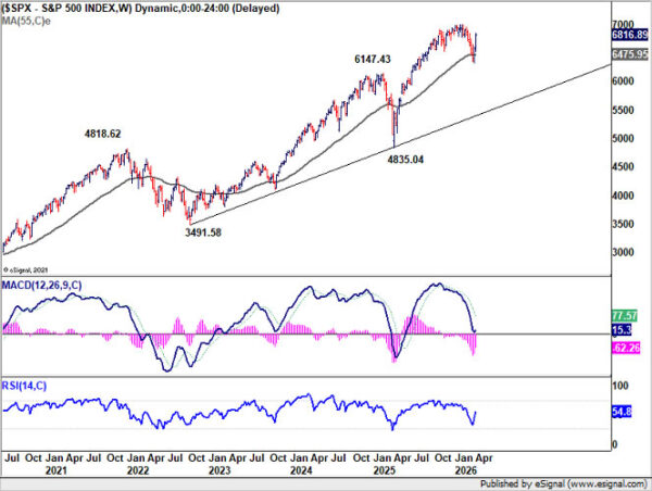 S&P 500’s strong rebound last week suggests that the corrective decline from 7,002.28 has likely completed at 6,316.91. Notably, firm support emerged from a key cluster zone, including 6,147.43 resistance-turned-support, 38.2% retracement of 4,835.04 to 7,002.28 at 6,174.39, and the 55 W EMA (now at 6,457.95). This confluence reinforces the view that the longer-term uptrend remains intact.