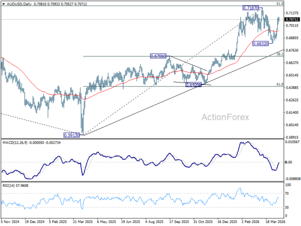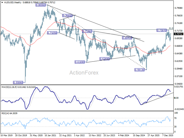 In the bigger picture, as long as 0.6706 cluster support holds, rise from 0.5913 (2024 low) should still be in progress. Decisive break of 61.8% retracement of 0.8006 to 0.5913 at 0.7206 will solidify the case that it’s already reversing the down trend from 0.8006 (2021 high). However, firm break of 0.6706 will dampen this bullish case, and bring deeper fall back to 0.6420 support, and possibly below.