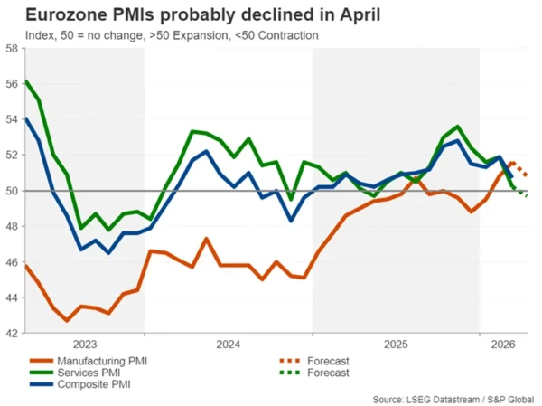 The flash PMI estimates could add to the gloom if there’s further deterioration in April, raising the prospect of stagflation. On a more positive note, it seems that the UK economy got off to a much stronger start in the first two months of 2026 than anticipated and so any upside surprises in the PMIs would give the Bank of England less reason to be cautious, especially if combined with hotter-than-expected CPI data.