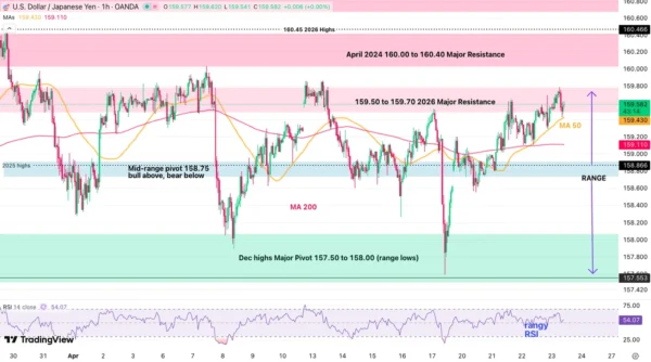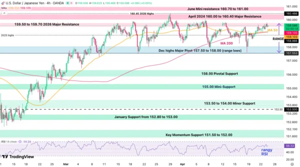 Since reaching new 2026 highs on March 27, the pair has been stuck in a clear 2,000 pip range between 157.50 and 159.50 (+/- 100 pips).