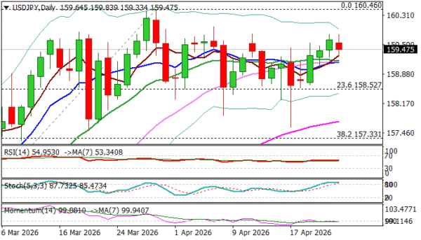 USDJPY keeps firm tone and trading near psychological 160 barrier, with near term action being slower on Friday, in comparison to strong gains in previous few sessions.