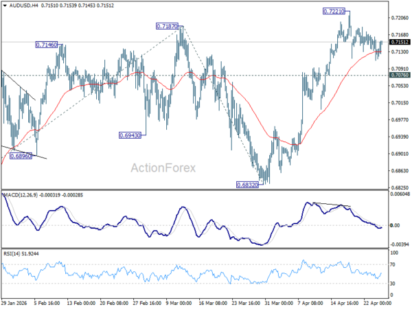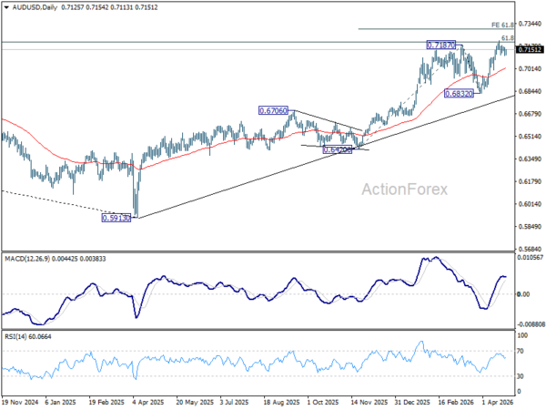 AUD/USD edged higher to 0.7221 but retreated since then. Initial bias remains neutral this week for more consolidations first. On the upside, firm break of 0.7221 will extend larger up trend to 61.8% projection of 0.6420 to 0.7187 from 0.6832 at 0.7306. On the downside, break of 0.7076 minor support will turn bias back to the downside for deeper pullback.