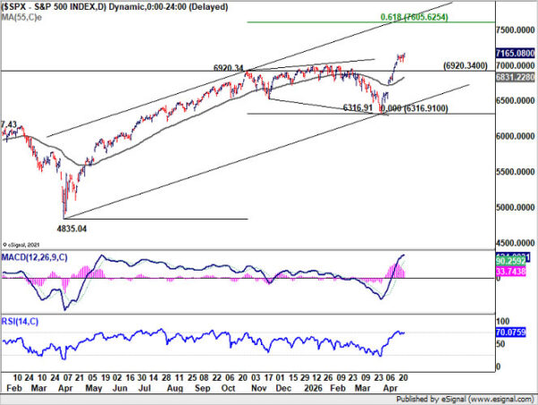 Similarly, the uptrend in S&P 500 extended further, with a new record close at 7,165.08. Further rise is expected as long as 6,920.34—also turned support—holds. The next upside target is 61.8% projection of 4,835.04 to 6,920.34 from 6,316.91 at 7,605.62.
