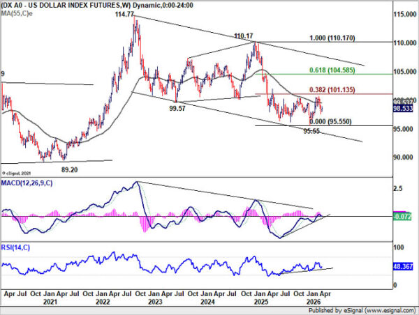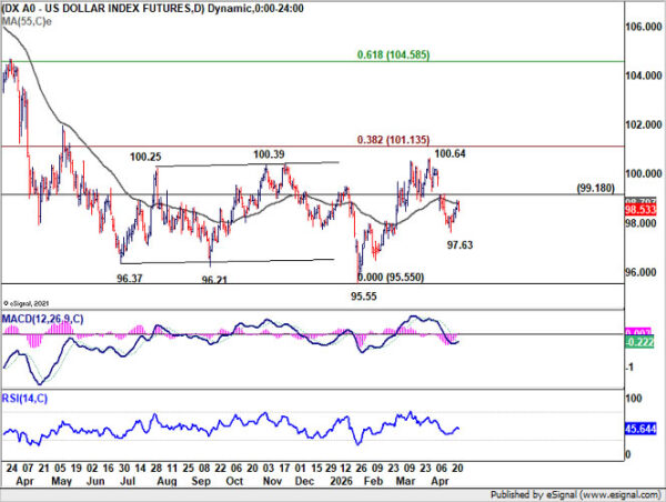 Dollar Index showed signs of exhaustion. The recovery from 97.63 extended higher but stalled at 55 Day EMA (now at 98.97). The outlook remains unchanged, with decline from 100.64 seen as reversal of the prior rebound from 95.55. Further downside is expected as long as 99.18 resistance caps. A break below 97.63 would open the way for a retest of the 95.55 low. That said, a firm break above 99.18 would neutralize the immediate bearish outlook and shift focus back toward the 100.64 resistance.