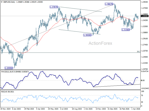 GBP/USD turned into consolidations last week and outlook is unchanged. Initial bias remains neutral this week first. On the upside, firm break of 61.8% retracement of 1.3867 to 1.3158 at 1.3596 will pave the way to retest 1.3867 high. However, break of 1.3379 will bring deeper fall back to 1.3158 low instead.