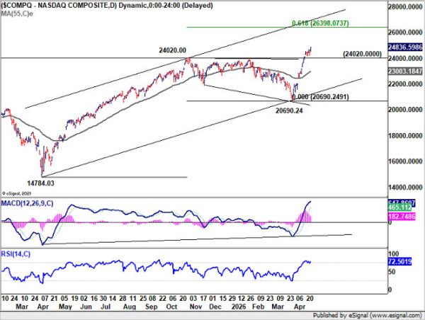 After some initial hesitation, the uptrend in NASDAQ extended decisively last week, with a strong rally pushing the index to a fresh record close at 24,836.59. Further upside is expected as long as 24,020.00—now turned support—holds. The next target lies at 61.8% projection of 14,784.03 to 24,020.00 from 20,690.24 at 26,398.07. However, strong resistance could emerge ahead of the medium-term channel ceiling near the 27,000 level, potentially capping gains.
