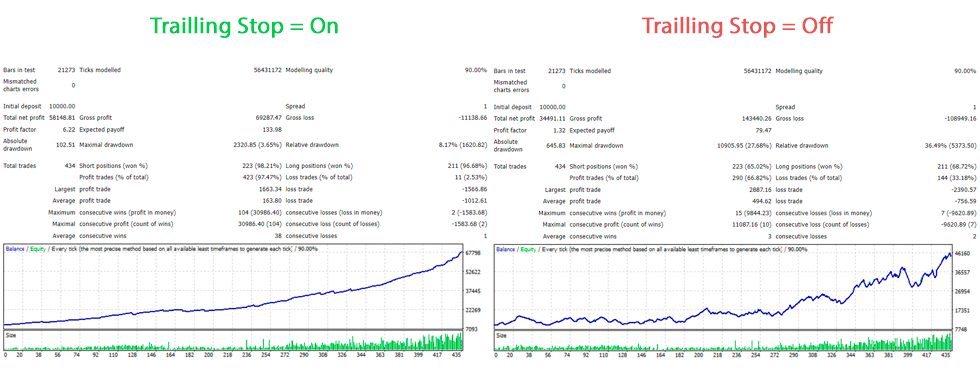 Which profitability chart do you like best? On the pictures you can see backtests of the Prop Master Expert Advisor with Trailing Stop enabled and disabled. I think the difference is obvious.