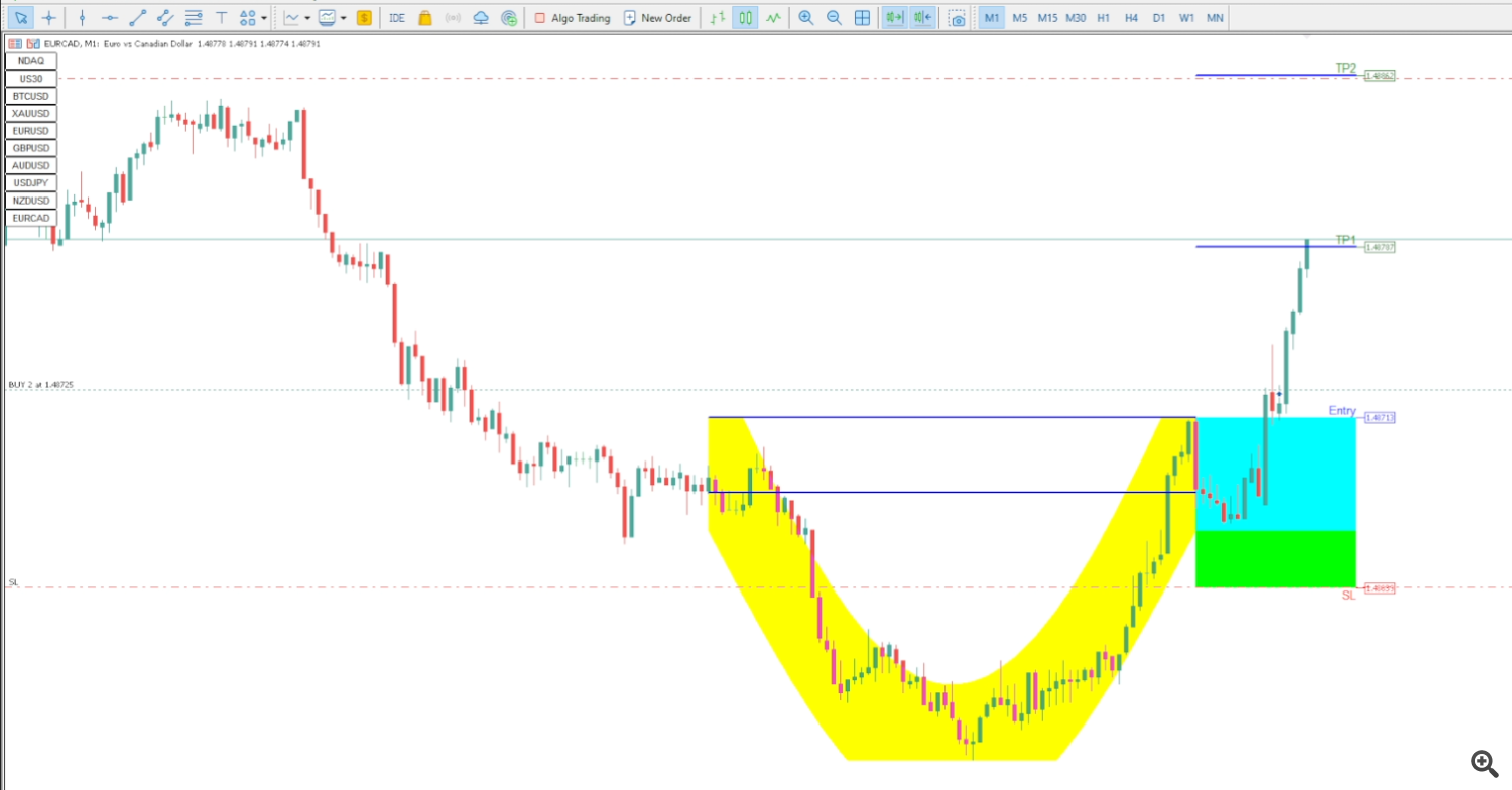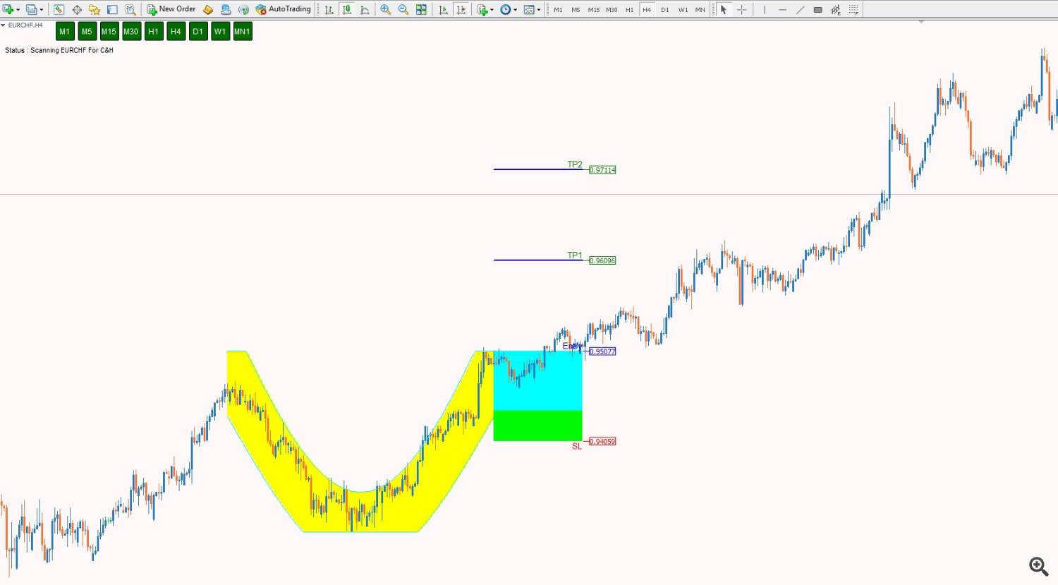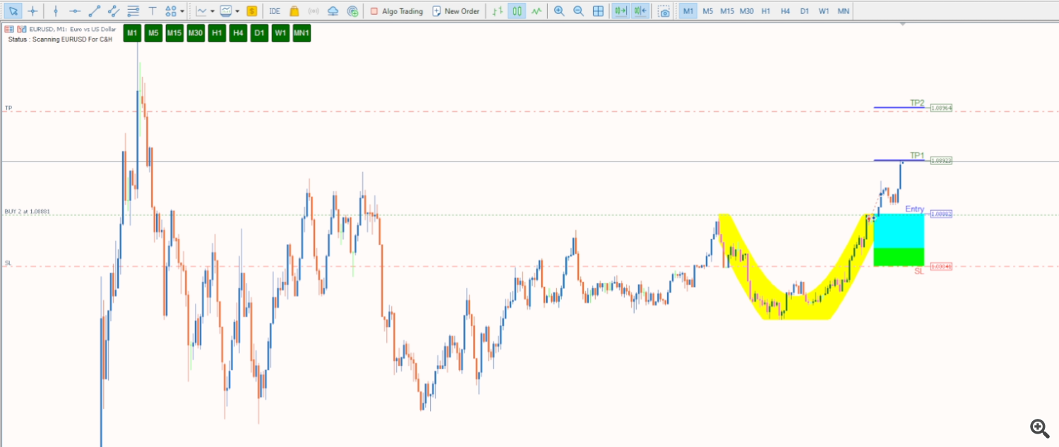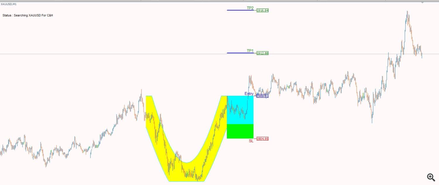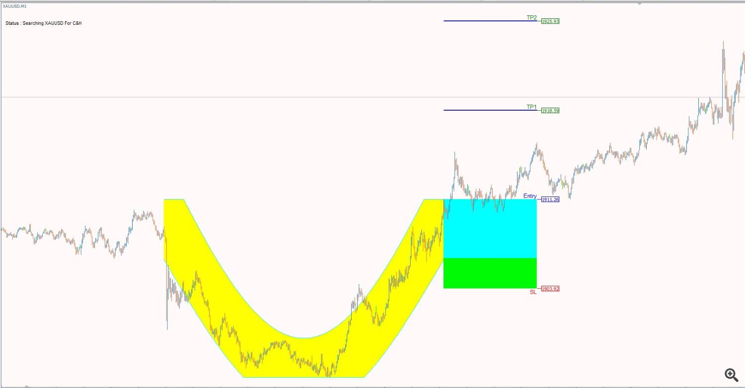 Cup & Handle chart pattern is the most reliable in technical analysis. Its shape resembles a cup with a handle on the right side. 20+ years of trading research show that the cup and handle pattern has a 95% success rate. The cup and handle is reliable and accurate but can be difficult to identify. With our indicator you can easily Discover this pattern, set stop loss and take profit and trade the cup and handle to improve your trading results!