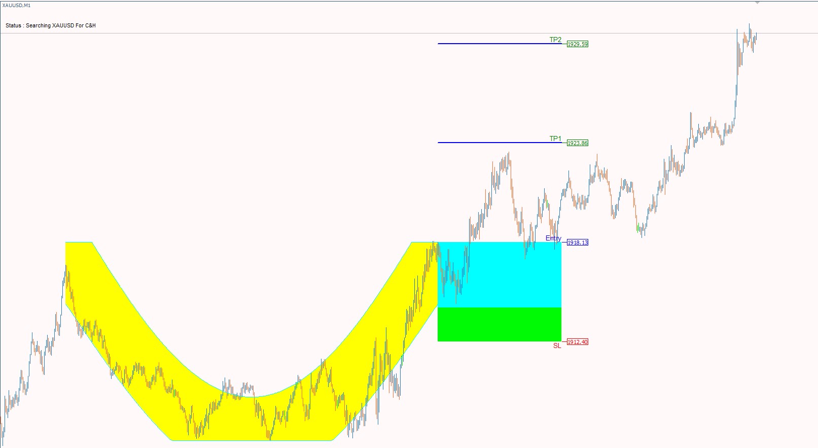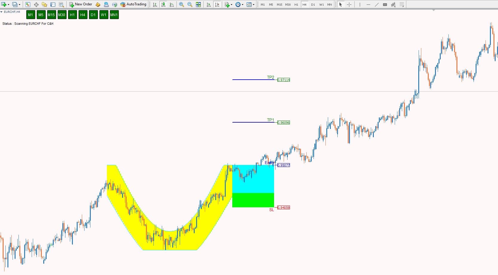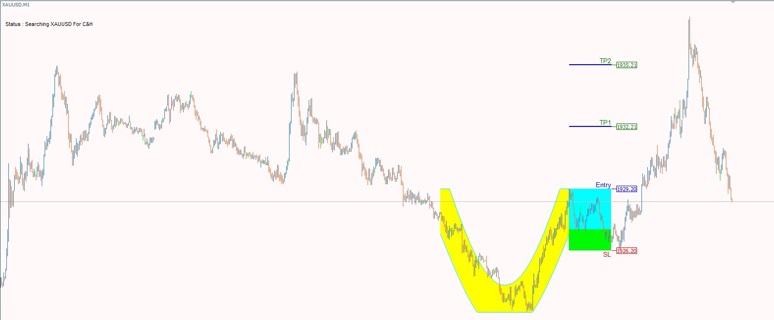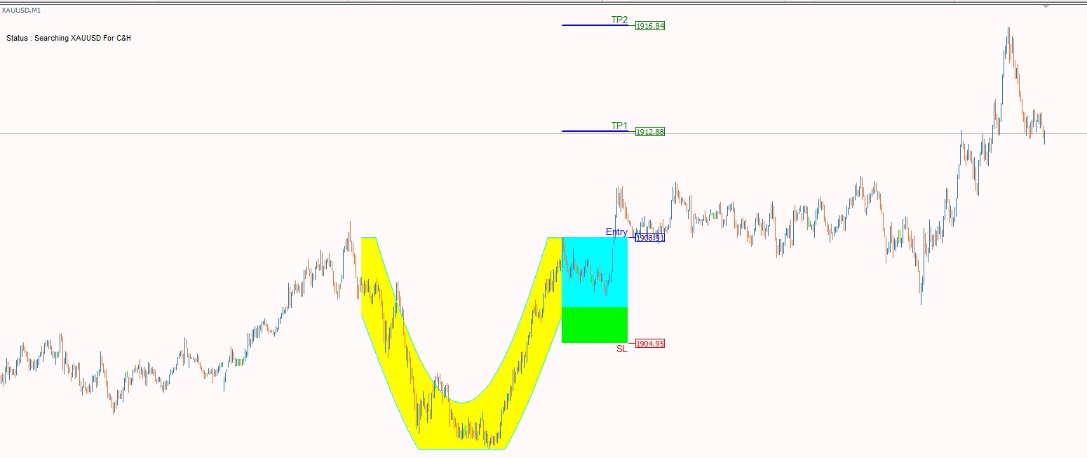Cup & Handle chart pattern is the most reliable in technical analysis. Its shape resembles a cup with a handle on the right side. 20+ years of trading research show that the cup and handle pattern has a 95% success rate. The cup and handle is reliable and accurate but can be difficult to identify. With our indicator you can easily Discover this pattern, set stop loss and take profit and trade the cup and handle to improve your trading results!