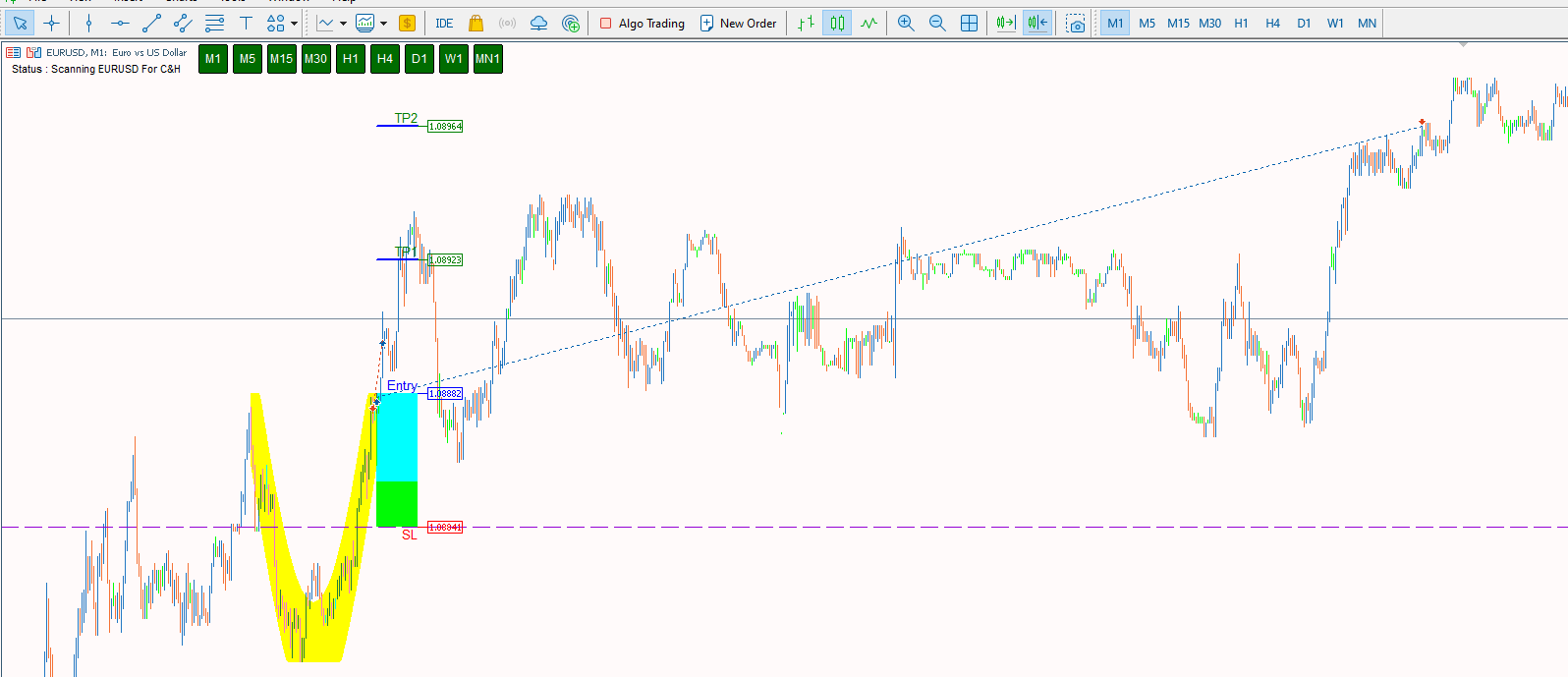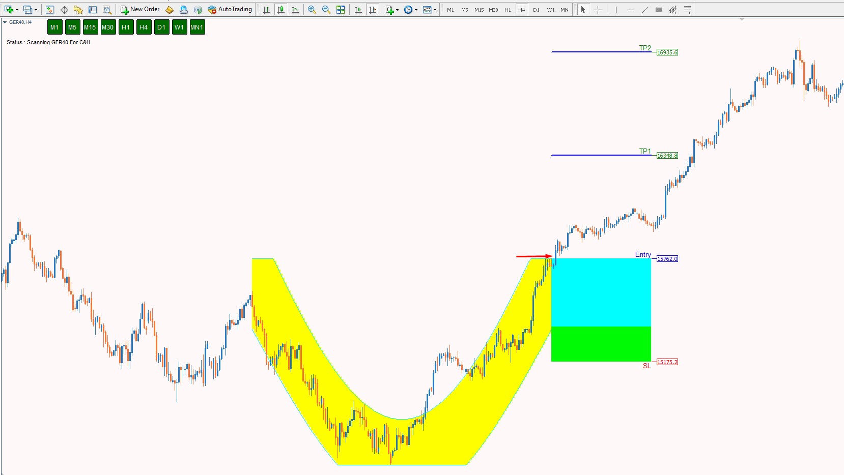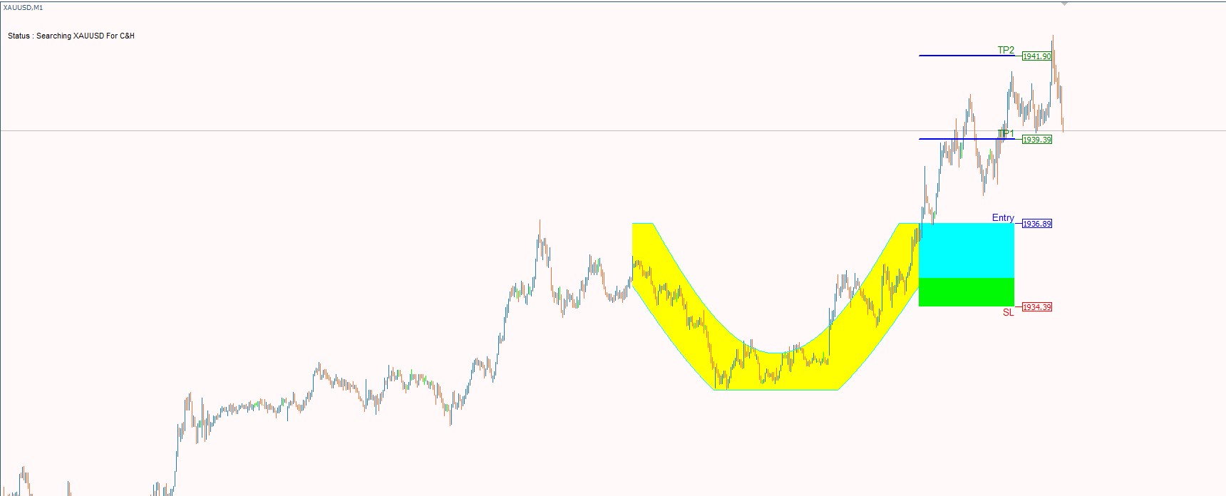 Cup & Handle chart pattern is the most reliable in technical analysis. Its shape resembles a cup with a handle on the right side. 20+ years of trading research show that the cup and handle pattern has a 95% success rate. The cup and handle is reliable and accurate but can be difficult to identify. With our indicator you can easily Discover this pattern, set stop loss and take profit and trade the cup and handle to improve your trading results!