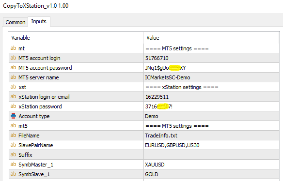 Note: Specify MT5 account and xStation account data, copied pairs and other utility parameters: