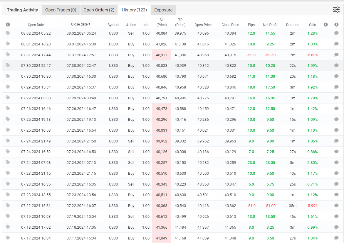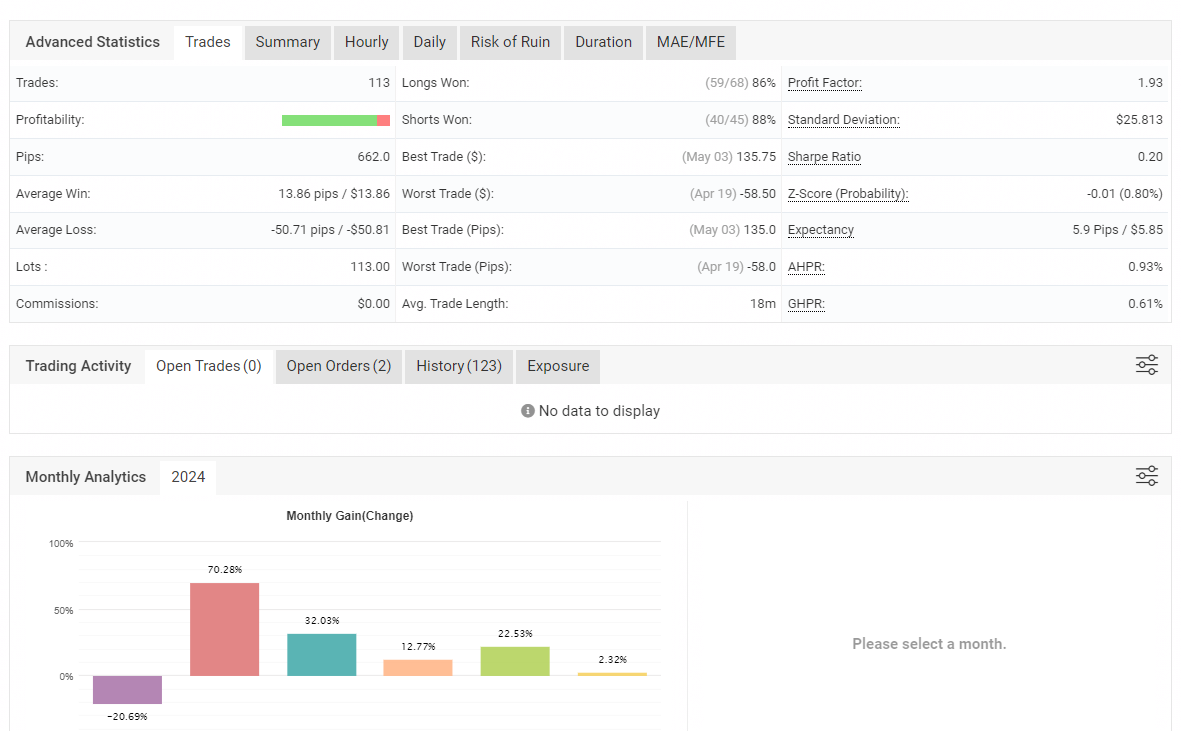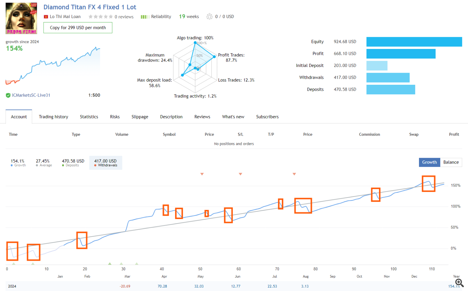 – Complete Win and Loss Records: An EA with a 100% win rate is often unreliable because it can hide potential risks. It’s crucial to have a balance between winning and losing trades, which helps accurately assess the EA’s recovery ability and actual performance. You should consider the win/loss ratio, maximum drawdown, and average profit ratio.