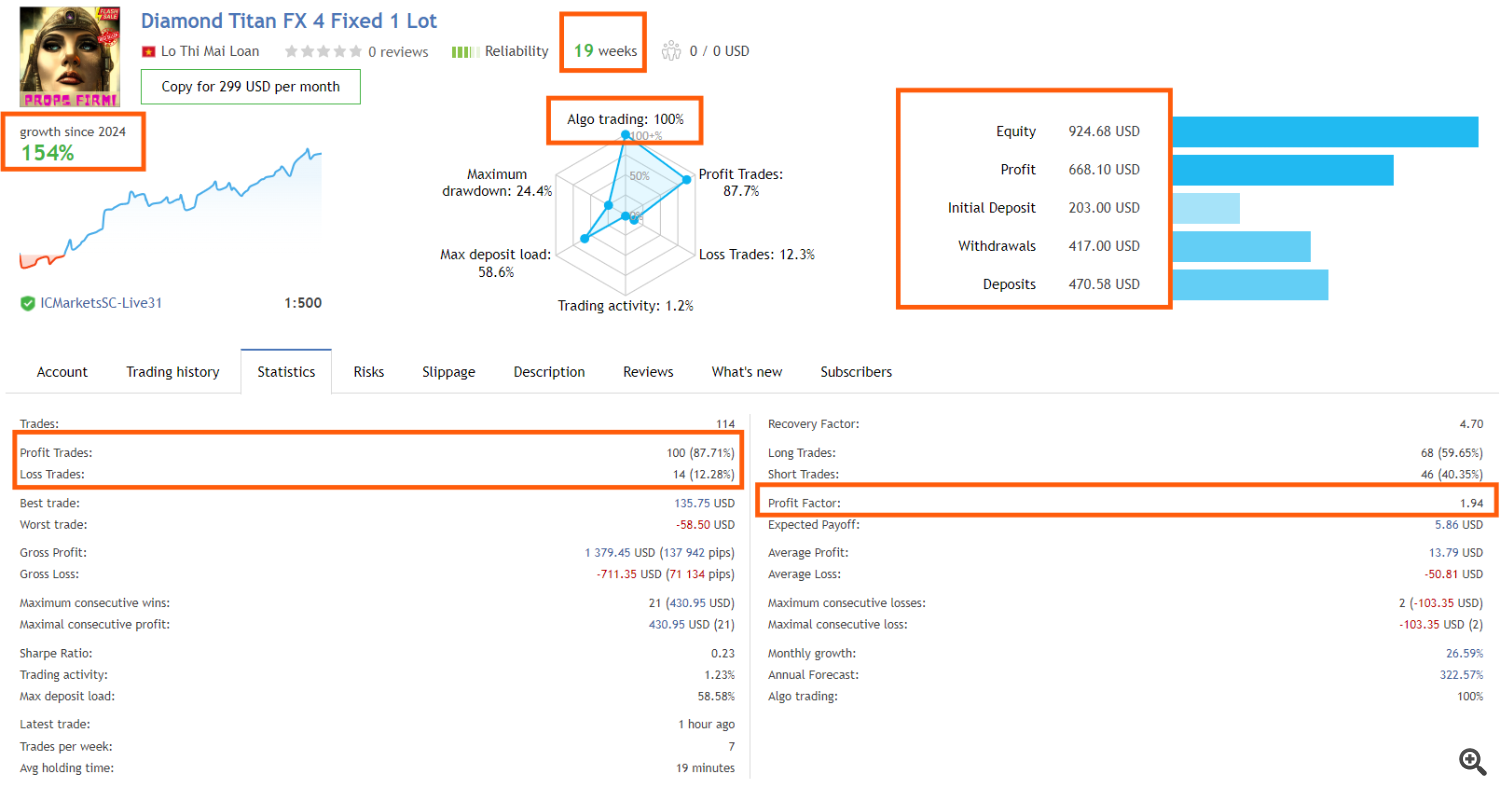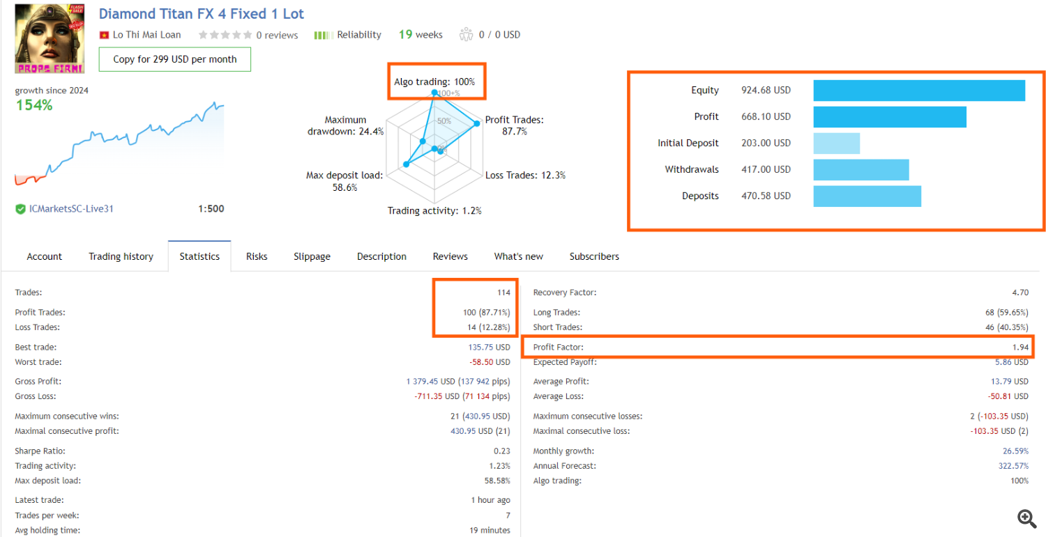 – Clear and Transparent Live Signals (NOT DEMO): The first important criterion is that the EA must have clear and transparent live signals. A transparent live signal provides detailed information about the trades executed, including parameters such as trade time, currency pair, trade volume, profit, and loss. Specifically, this signal should have at least 100 trades to ensure the EA’s representativeness and reliability.