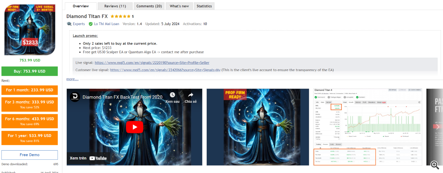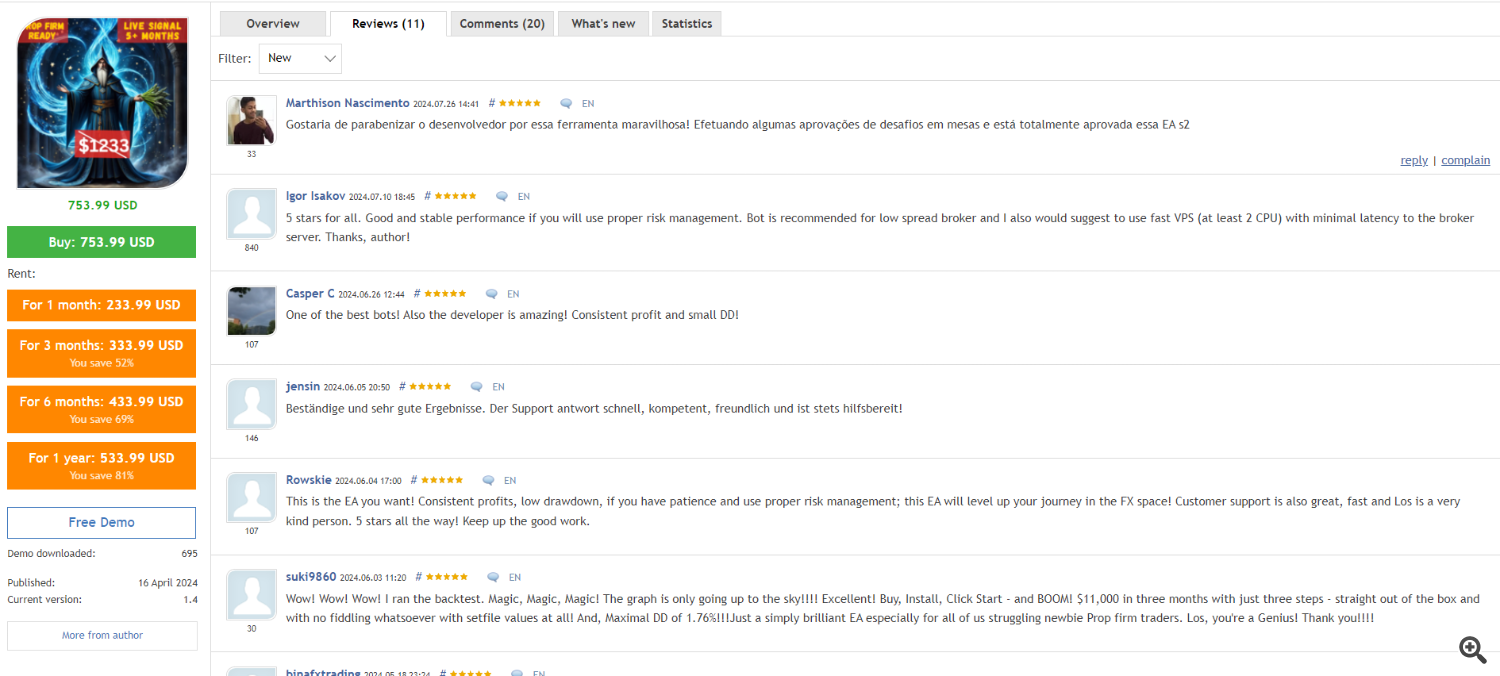 – Good Reputation: The seller must have a good reputation in the trading community and receive many positive feedbacks from users. You can check the seller’s reputation through reviews on websites like MQL5, Myfxbook, or trading forums.