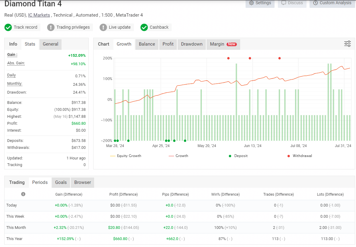 Illustrative images of Diamond Titan EA’s trades will give you a clear view of the EA’s performance and operation. You can review detailed trade reports and performance charts to accurately assess the effectiveness of Diamond Titan EA.