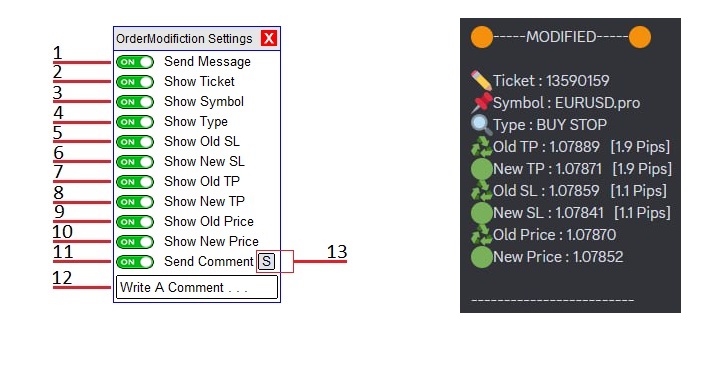 - Send the order modification New Take Profit Price (Pips)