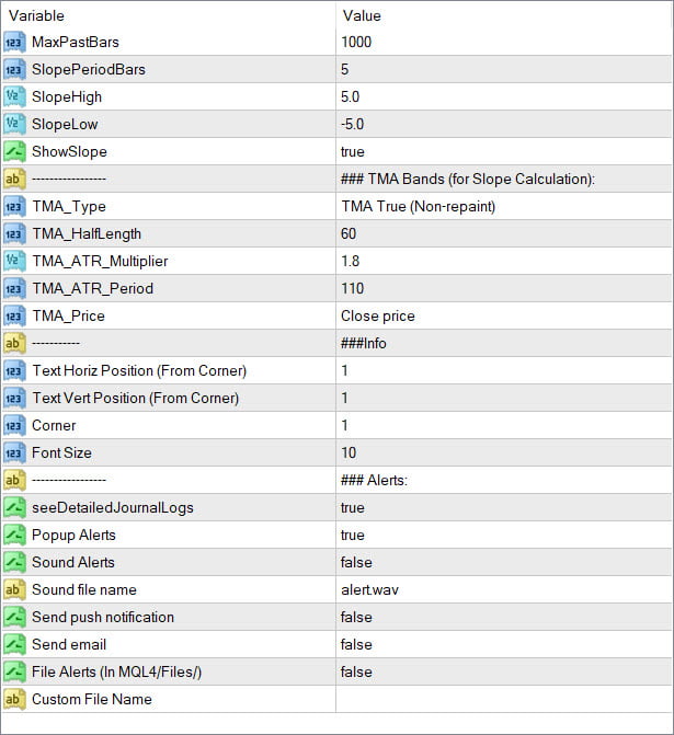 And also set Slope Period Bars. Default is 5, which means it will measure the TMA middle line values for past 5 bars and find the Slope based on time for past 5 bars.