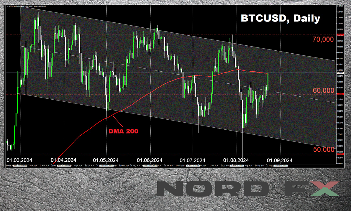 ● As of the time of writing this review, on the evening of Friday, 23 August, the BTC/USD pair is still far from reaching $10 million or $50 million. However, following the dovish speech by Fed Chair Jerome Powell in Jackson Hole, the pair capitalized on the weakening dollar, surged upwards, and reached a height of $64,200. The total market capitalization of the crypto market now stands at $2.24 trillion (up from $2.08 trillion a week ago). The Crypto Fear & Greed Index has risen from 27 to 34 points but remains in the Fear zone.