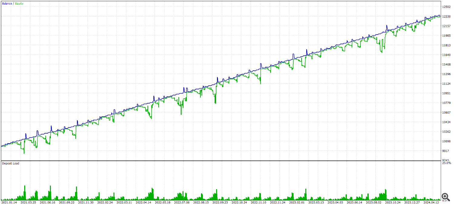 Let’s proceed with the backtest to visually assess how our linear optimization process is performing. This will allow us to directly observe the expert advisor’s performance and verify whether the implemented improvements are delivering the expected results. The visualization of trades will help identify any additional adjustments needed to further optimize its performance.