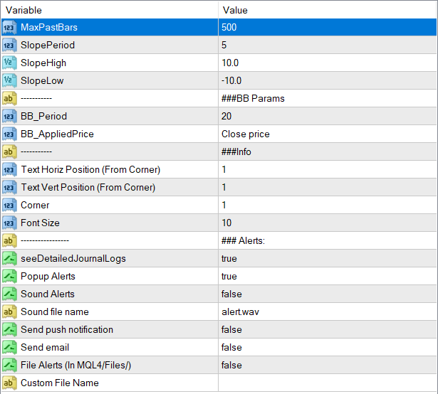 This is a slope indicator for Bollinger Bands indicator. It provides slopes for BB top band, center band (main) and Lower Band.