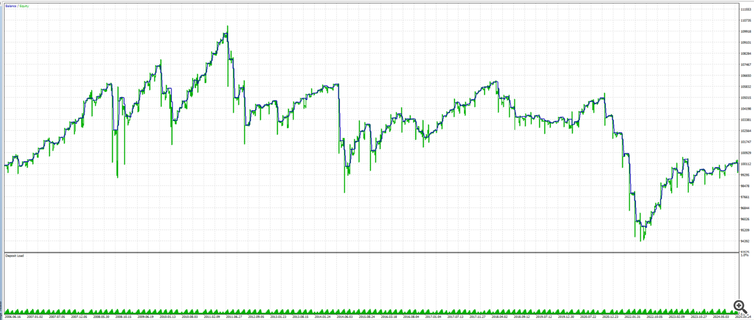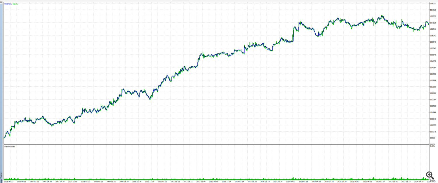To evaluate the effectiveness of the Advanced Dynamic RSI, I created a trading strategy and conducted initial backtests on historical data of the EURUSD pair, starting from 2006. The test presented here was run on a 4-hour chart, combined with a simple trend filter and a basic cross logic based on the indicator’s dynamic overbought and oversold lines. For the initial test, a fixed lot size of 0.1 was traded, and a rough optimization of the parameters was performed. The results of these tests provide promising insights and motivate me to continue working on this indicator.