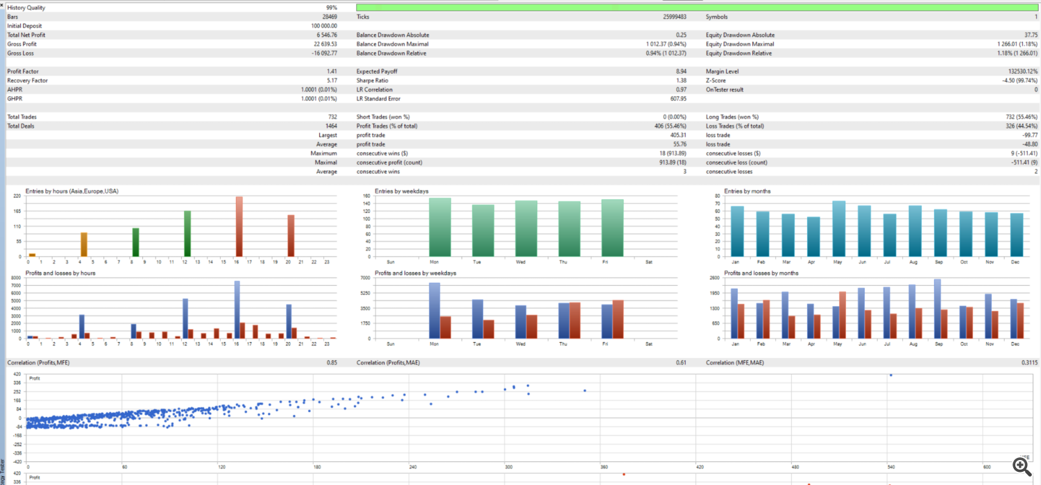 - Total Trades: 732 trades, of which approximately 55.46% were successful.