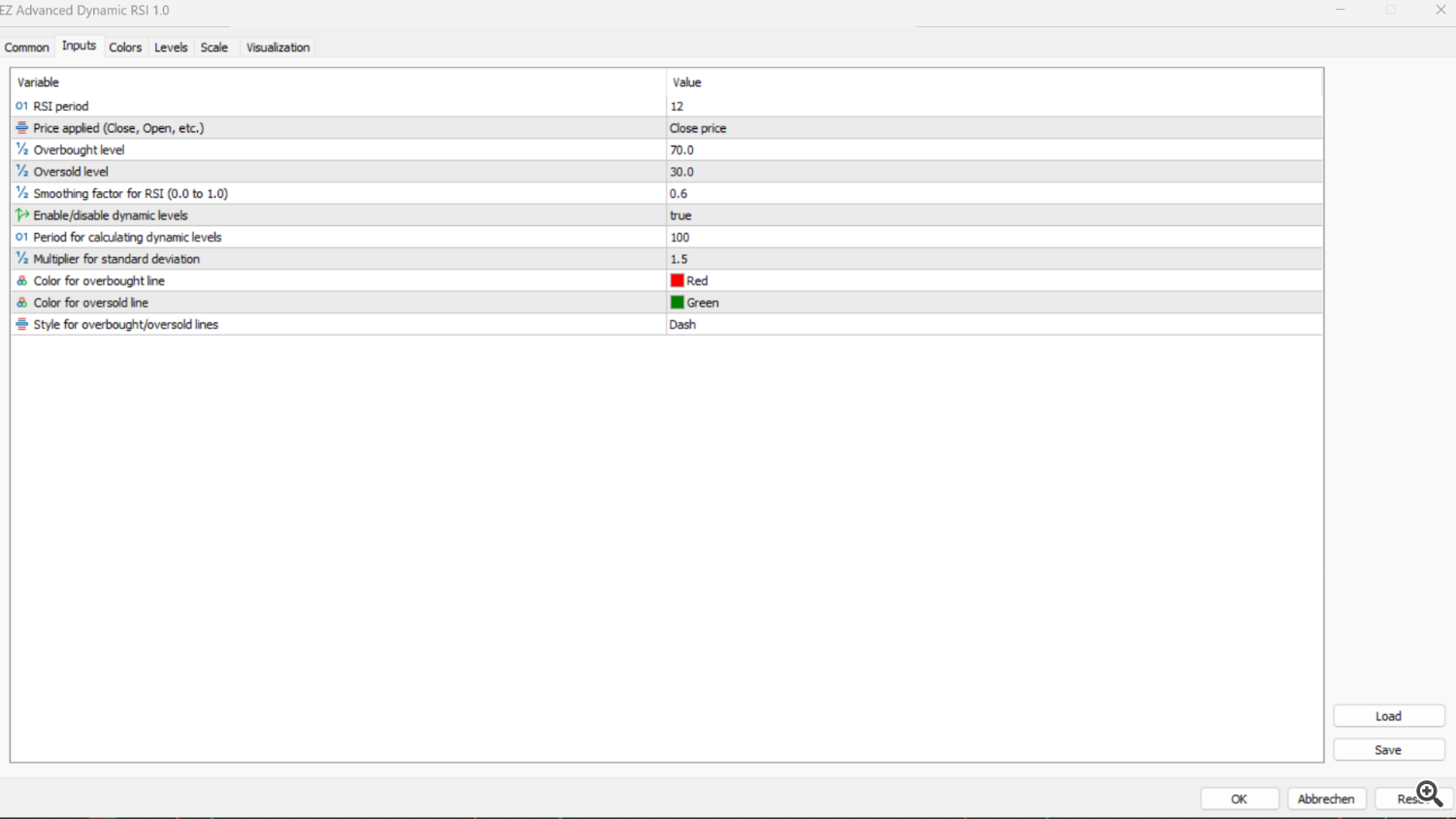 - Visual Customization: The colors and line styles, for example, for the overbought and oversold levels, can be customized to suit individual preferences and optimize visual representation in the chart.