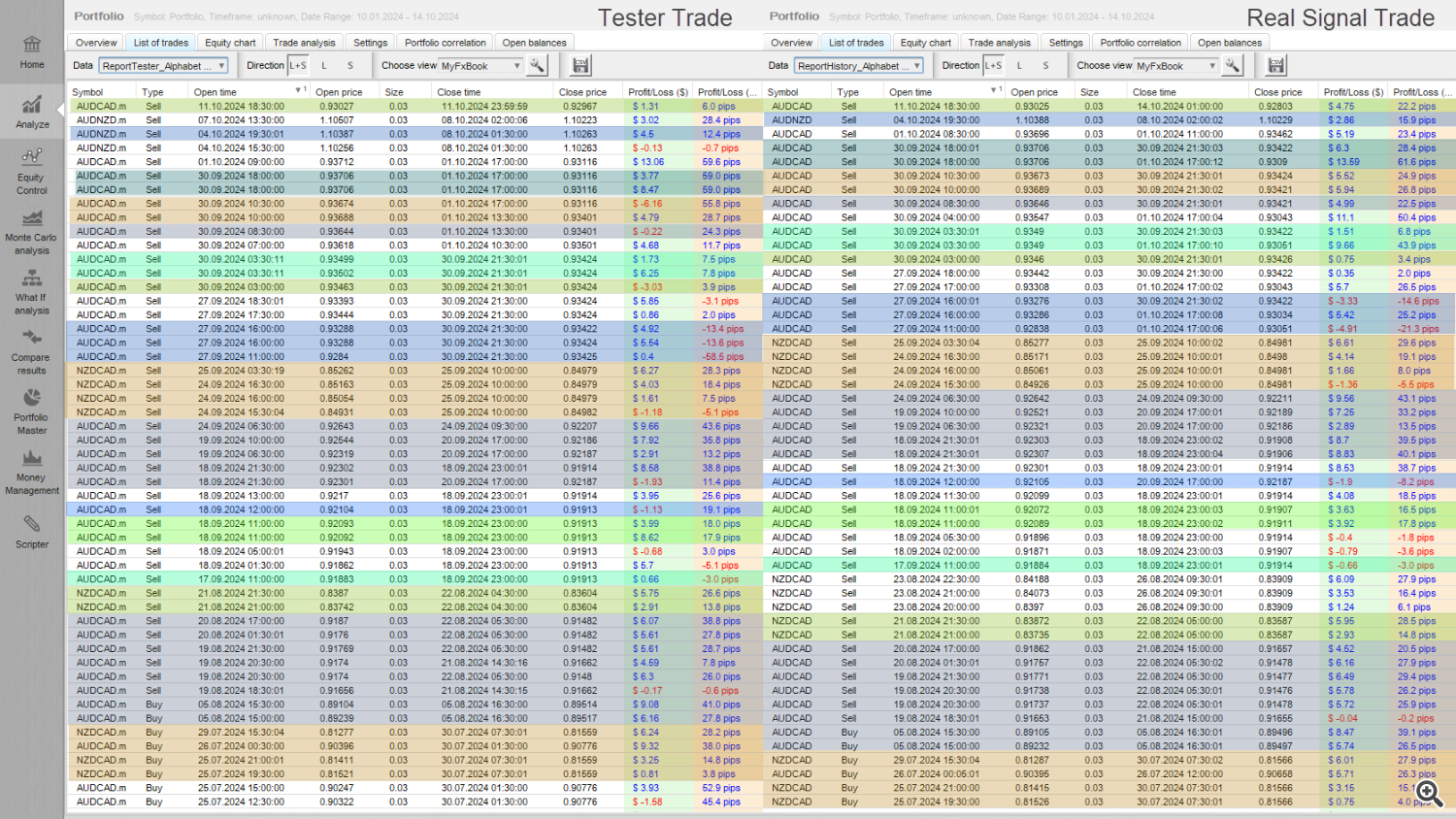 Additionally, let’s take a closer look at the chart based on trades from the last few months. In the table below, I highlighted the trades that match between the test and the real trading reports. As shown, the majority of trades coincide in both time and results.
