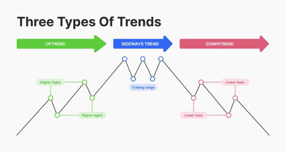 A sideways trend, often referred to as a range-bound market, occurs when prices oscillate horizontally over a period of time, showing little to no significant movement in either direction.This indicates a balance between buying and selling pressure, where the market is indecisive. During this trend, prices may fluctuate within a specific range, and traders often find it more challenging to make predictions. A sideways trend can be a signal of market consolidation, where buyers and sellers are assessing the market before making further moves. Each of these trends reflects different market conditions and investor sentiments, and understanding them is key to effective trading and investment strategies.