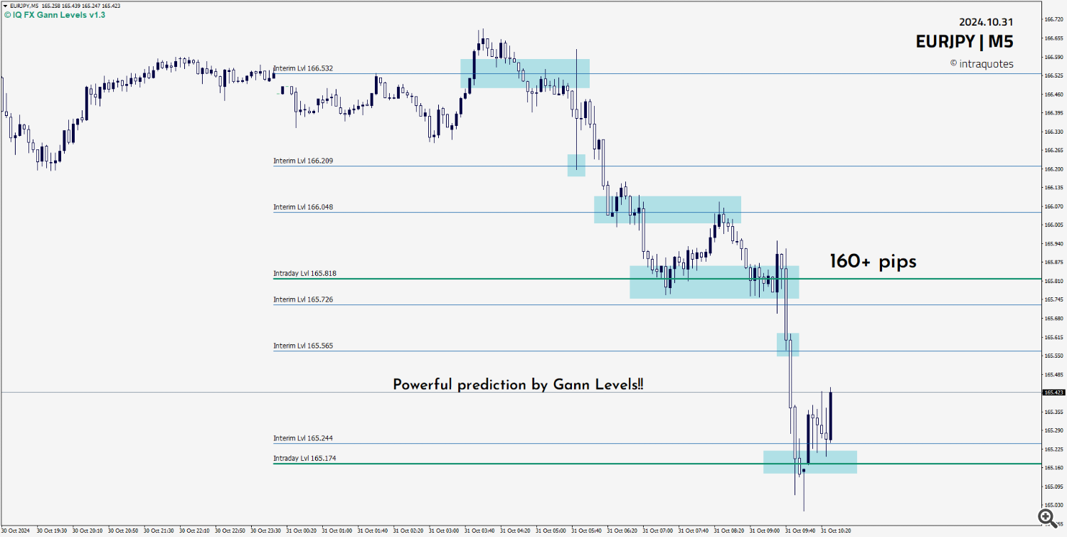 - Powerful Decline: A clear 160+ pip drop occurred after touching the Gann interim resistance level of 166.532. You could capture these moves by simply monitoring the price action around these Gann levels.
