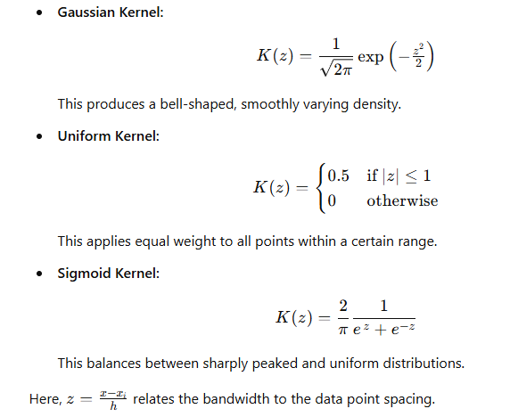 Selecting a Kernel Function: Several kernel options may be available, such as Gaussian, Uniform, and Sigmoid. Each kernel defines how influence diminishes as the distance from a data point increases.