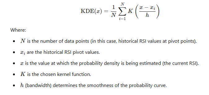 Constructing the Probability Distribution: After choosing the kernel and bandwidth, KDE is applied to the sets of pivot RSI values. The result is a continuous probability distribution, indicating how likely the current RSI is to be near historically significant pivot levels.